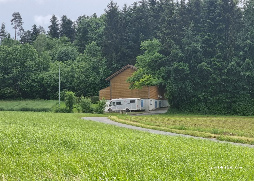 Abgelegener Parkplatz bei einem Schützenhaus, leicht abschüssig, windgeschützt.