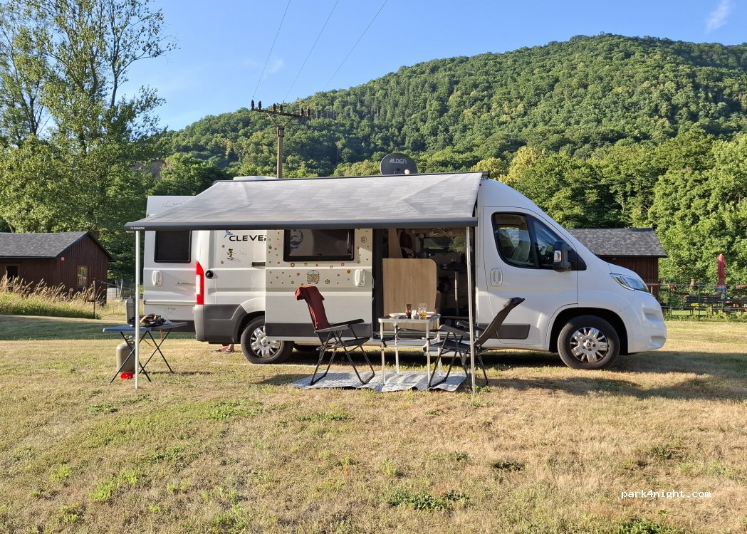 Ein sehr schönes Fleckchen Erde umgeben von Hügeln und einem Fluss in einem kleinen Dorf. Die Wiese ist riesig, man bekommt von den sehr netten Gastgebern Strom (Wasser brauchten wir nicht für eine Nacht), der Stellplatz war eben, keine Keile notwendig. Wir durften am nächsten Tag so lange bleiben wie wir wollten. Gerne wieder! (Nur 15€ für Ruhe und Natur pur). Top!