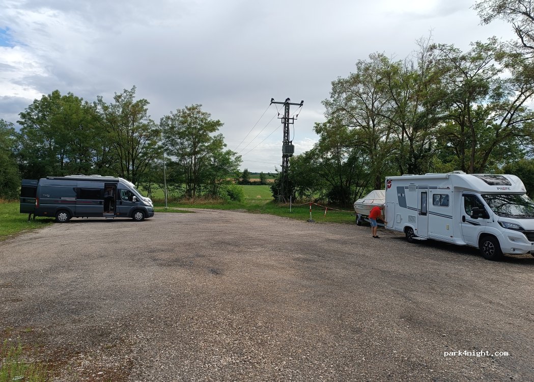 The restaurant car park is pleasant enough but it is the restaurant, food, wine and beer plus the wonderful landlady which make this stop a five star. We paid €45 for a great pork knuckle meal for two, with plenty of drinks. No size restriction for the van