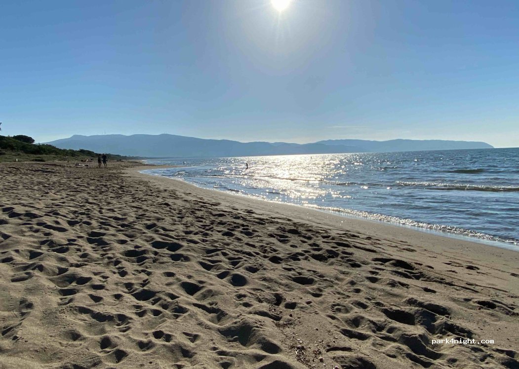 Großer Platz auch mit schattigen Bäumen. Durchgang zum Meer etwa 100 Meter. Schöner Sandstrand. Parkzeit 7 Uhr bis 20 Uhr. Camper ganztags 15 Euro halbtags 10 Euro. 5 Kilometer nach Albinia, 10 Kilometer nach Porto Stefano.