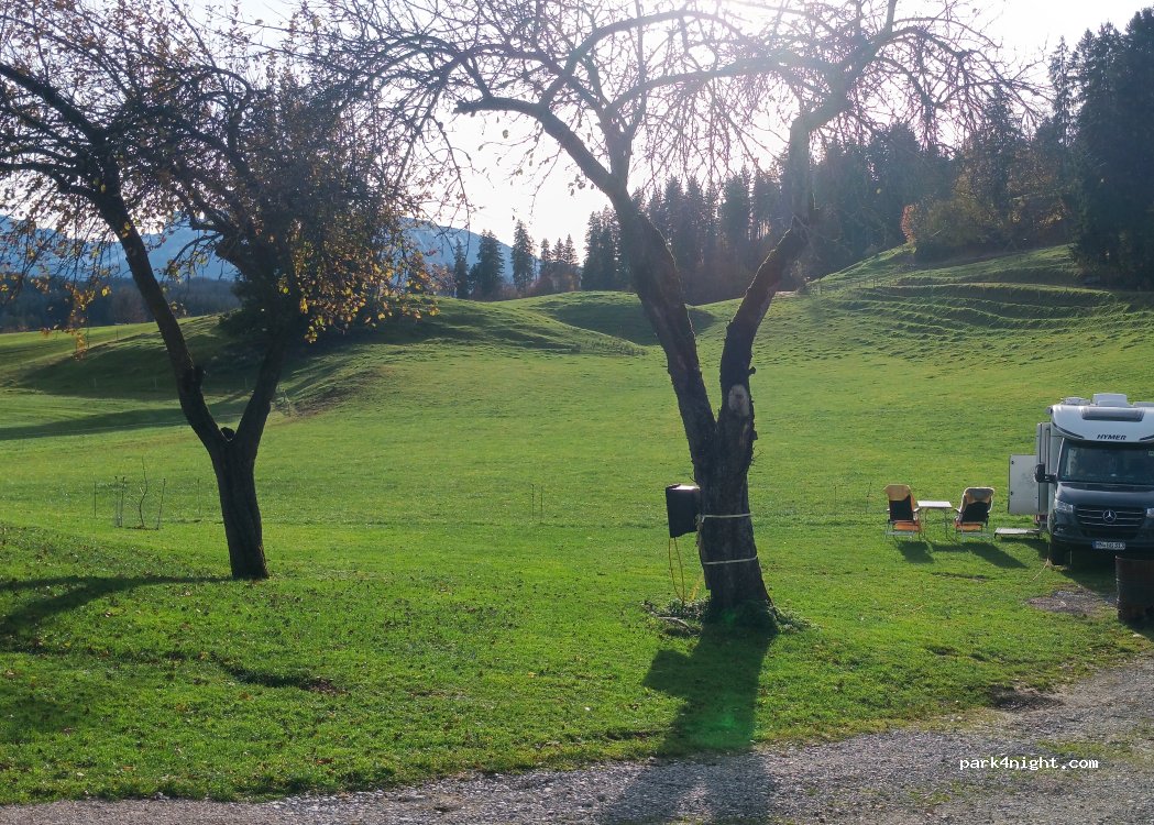 Einfach perfekt. Eigentlich keine weiteren Worte nötig. Dennoch: Platz für bis zu drei Camper bei herzlich freundlichen Gastgebern. Zu den Nachbarn gehören Ziegen, Kühe, Hühner, ein Truthahn und sein Harem sowie dem Platzhirsch der Gans „Psycho“ inkl. Gattin. Ab und an wedelt der Haushund Emma einem entgegen. Herrlichste Aussicht auf das Alpenpanorama von Zugspitze bis Breitenberg. Strom 3€/Tag. Lagerfeuer? Kein Problem! Eine Schubkarre mit Feuerholz inkl. Feuerkorb 10€. Getränke, verschiedene Biere und Softdrinks Flasche 2€. Aus einer geplanten Übernachtung wurden drei. Der nahe gelegene Bäcker (3min zu Fuß) sichert das Frühstück. Wir kommen wieder! PS: Voor Nederlanders. Het concept werkt hier redelijk, vooral als je ook een klein bedrag achterlaat voor een overnachting. Helaas zagen we in totaal vier gele kenteken wegrijden met weinig tot niets achterlatend. Dat is jammer en niet erg waardig. Vertegenwoordig ons alstublieft fatsoenlijk. Eén met een gele kenteken ;)
