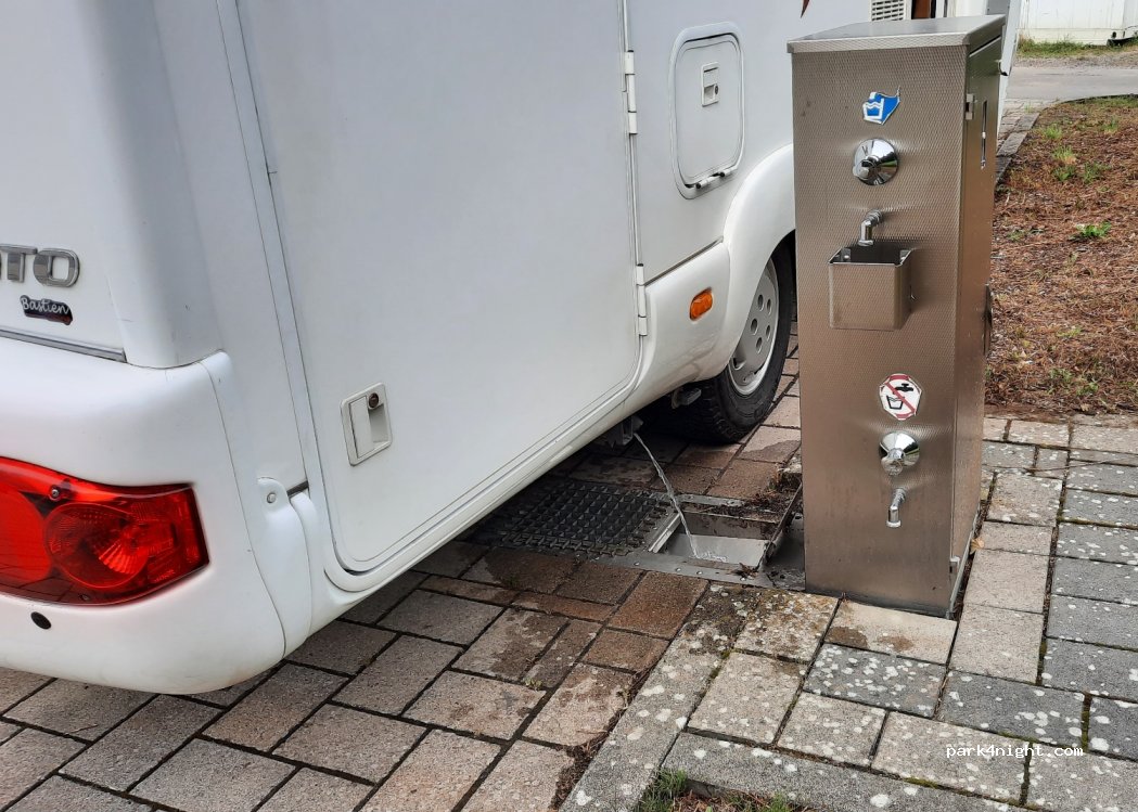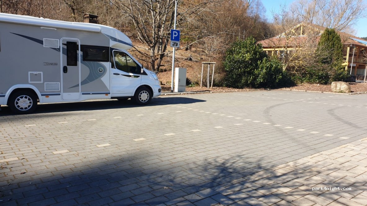 Parking space of the municipality of Krickenbach at the multi-purpose hall; paved square, access coming from the east a bit narrow for large campers; everything else great: VuE, electricity playground, picnic tables, hiking opportunities