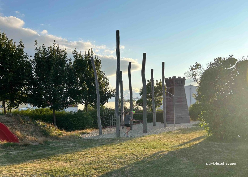 Nie znalazłem wody na tym postoju, nie znalazłem też punktu do serwisu, do spuszczenia wody szarej i WC. Miejsce spokojne z prądem i dużym fajnym placem zabaw!