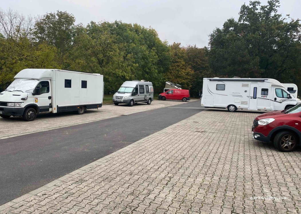 Sehr gut gelegener und halbwegs ebener Stellplatz mit Schatten spendendem Baumbestand. Zur Zeit wird dort eine Leitungsbaustelle betrieben, aber um 17:00 Uhr war Feierabend. Mehrere Lokale sind fußläufig in 5 bis 8 Minuten erreichbar. Die ruhigen Nachbarn stören nicht. Im hinteren Teil des Parkplatzes sind Glas- und Kleidersammelbehälter aufgestellt. Dadurch tagsüber etwas Verkehr.