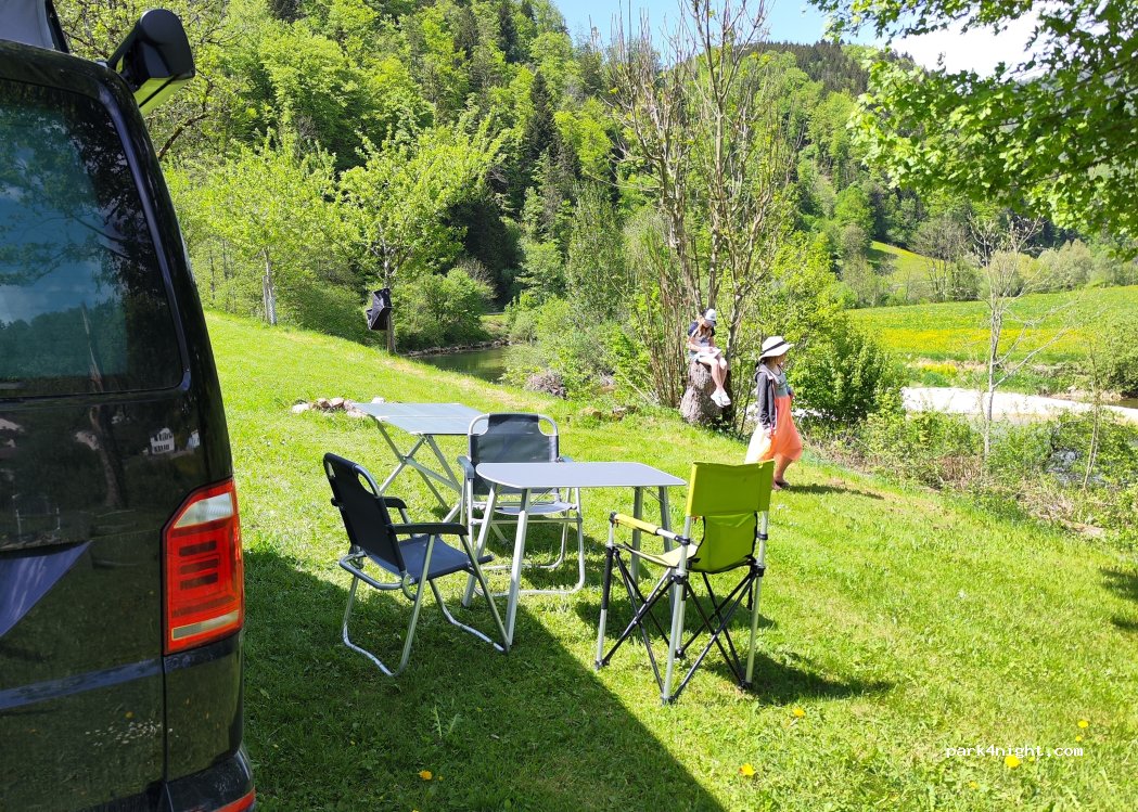 ruhige Wiese oberhalb der Doubs mit schönem Blick. Wir haben von hier eine sehr schöne Wanderung gemacht bei Regen ist die Wiese anspruchsvoll zu befahren zu den 8 Franken pro Person kommt noch das Fahrzeug extra und der Hund und die duschen also zahlten wir 25 Franken ohne Dusche