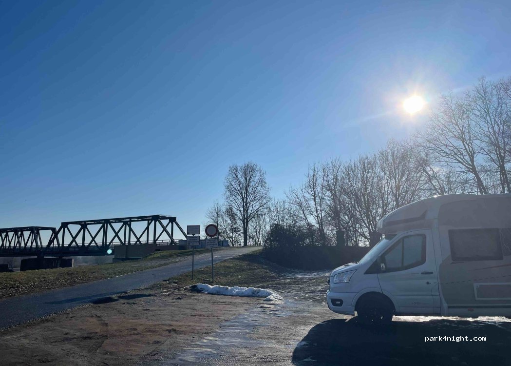Aire de repos de prairie au pont d'Oder Bienenwerder. Endroit non pavé, bonne route d'accès. Le pont est fermé. Par conséquent, l'endroit est au bout du cul-de-sac. Absolument calme. Pas de service. De la place, vous avez une belle vue sur les plaines inondables de l'Oder.