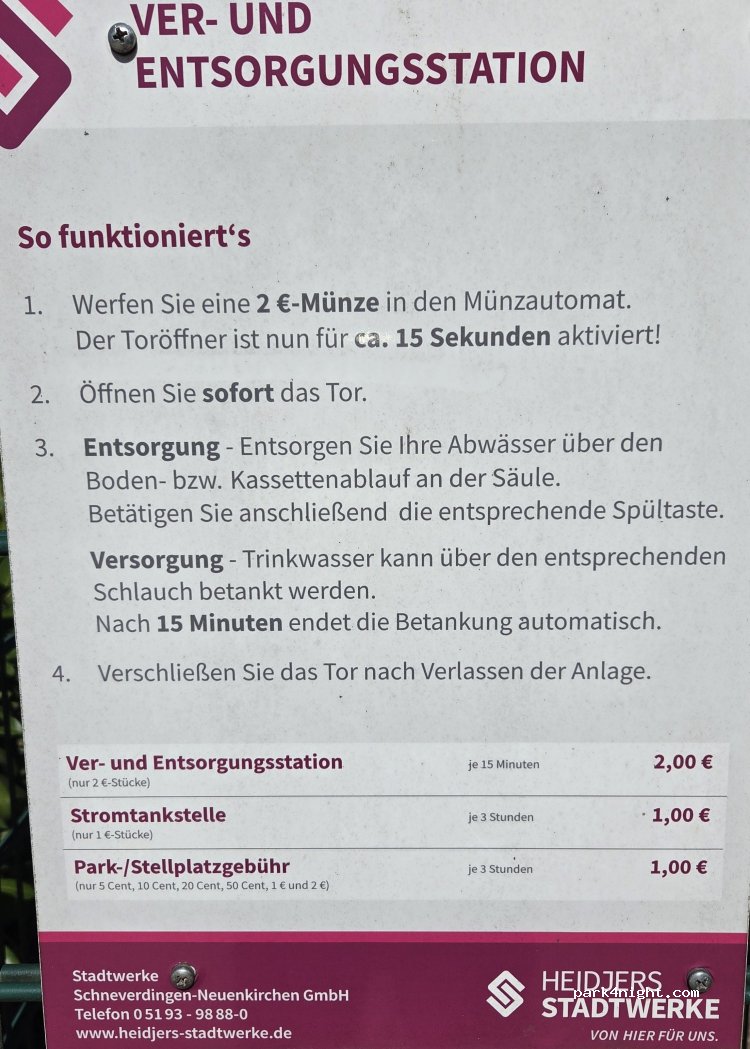 Wenn das Freibad geschlossen ist ein ruhiger Ort. Man benötigt 1 Euro und 2 Euro Münzen. Es hat alles funktioniert. Tor zur V/E muss innerhalb 15 sec geöffnet werden, das steht aber auch dran. Wasser gibt es dann für 15 min., Grauwasser über Bodeneinlass schwierig anzufahren für manche Fahrzeuge. Strom 3 Std. 1 Euro Parkgebühren je 3 Std. 1 Euro