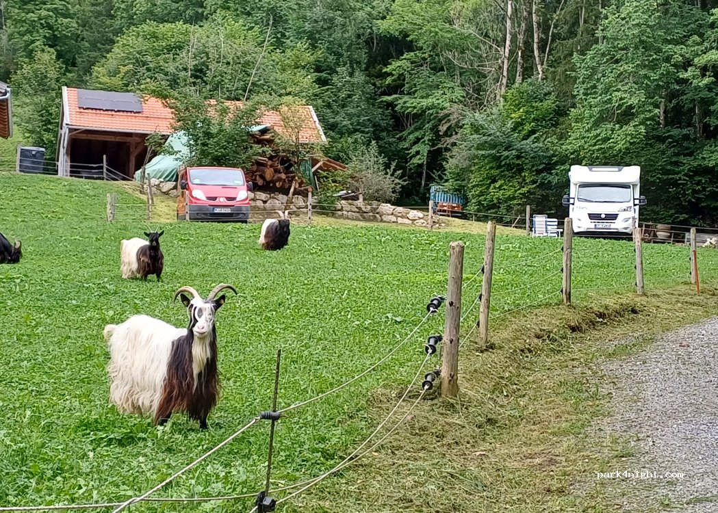 Beautiful pitch on a small organic farm with Highland cattle, goats, and a fish pond. The pitch is slightly elevated in front of a barn with very limited mountain views and is very quiet. Electricity and water are available on-site. Upon request. Only suitable for motorhomes with their own toilet and up to approximately 8 meters in length.