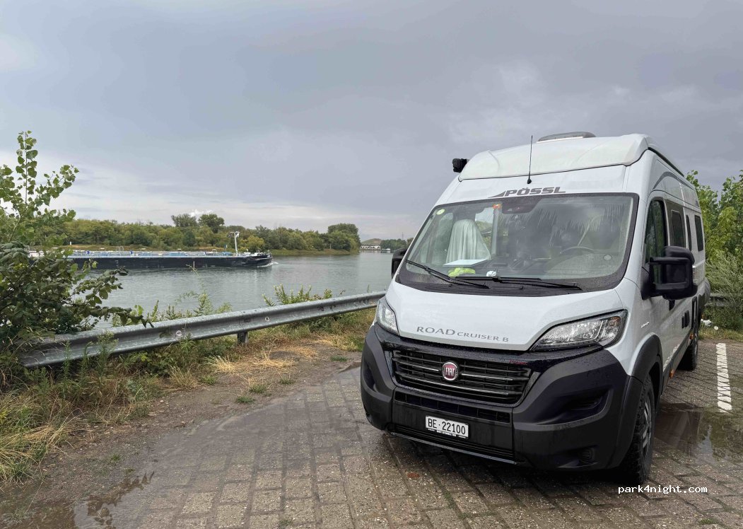 Parking directement au bord du Rhin. PLEIN en vacances, mais j'ai passé une nuit tranquille. Plage de gravier à proximité. Murmure lointain de l'autoroute. Aucun service, mais une camionnette de glaces est passée.