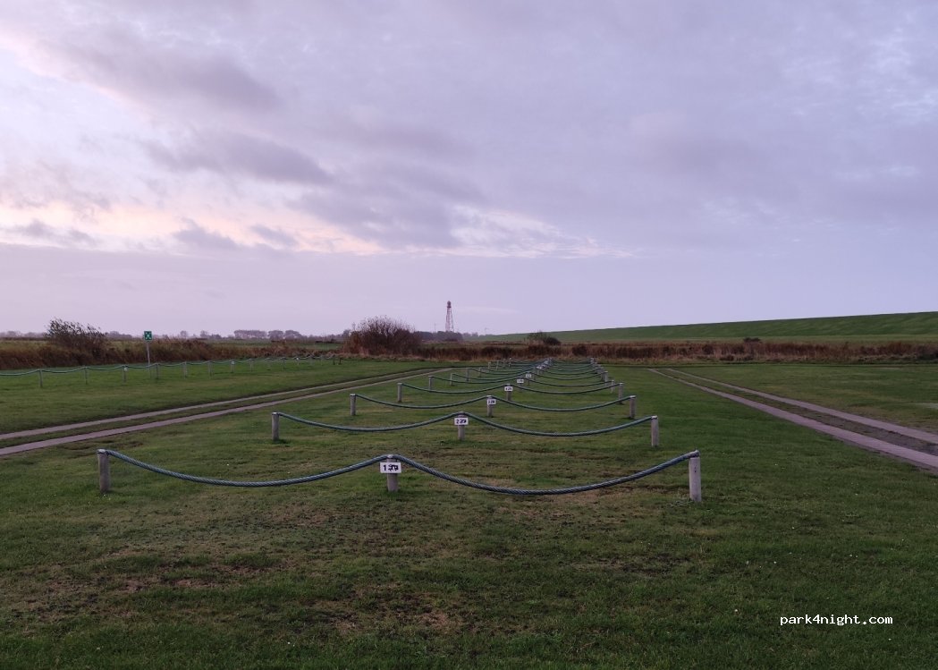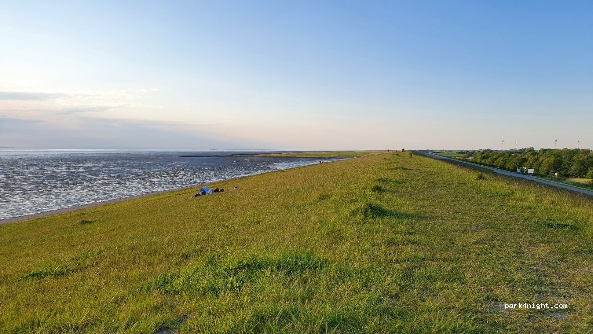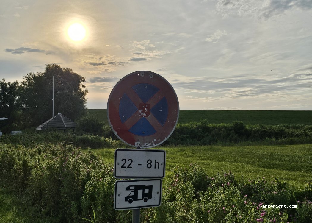 Large parking lot directly at the dike. There is even a kiosk, toilets and showers. The place is clean and quiet. Prohibited for motorhomes at night.