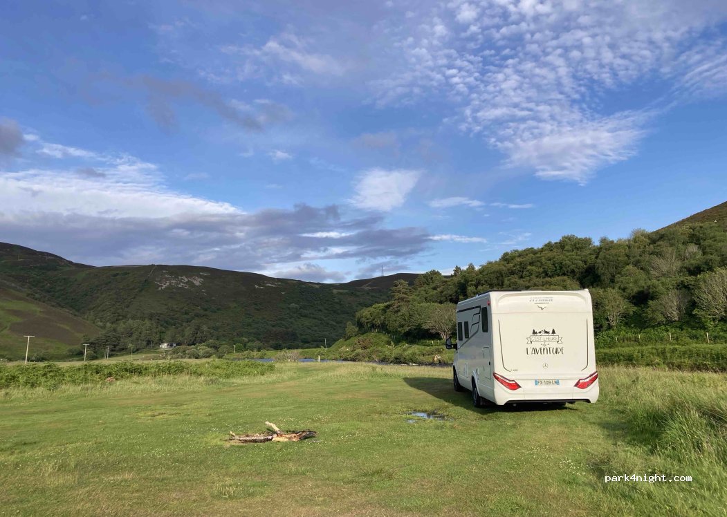 plus de place à cet endroit mais un peu plus loin. cadre magnifique avec le loch entouré de genêts et acces à une plage. route très tranquille