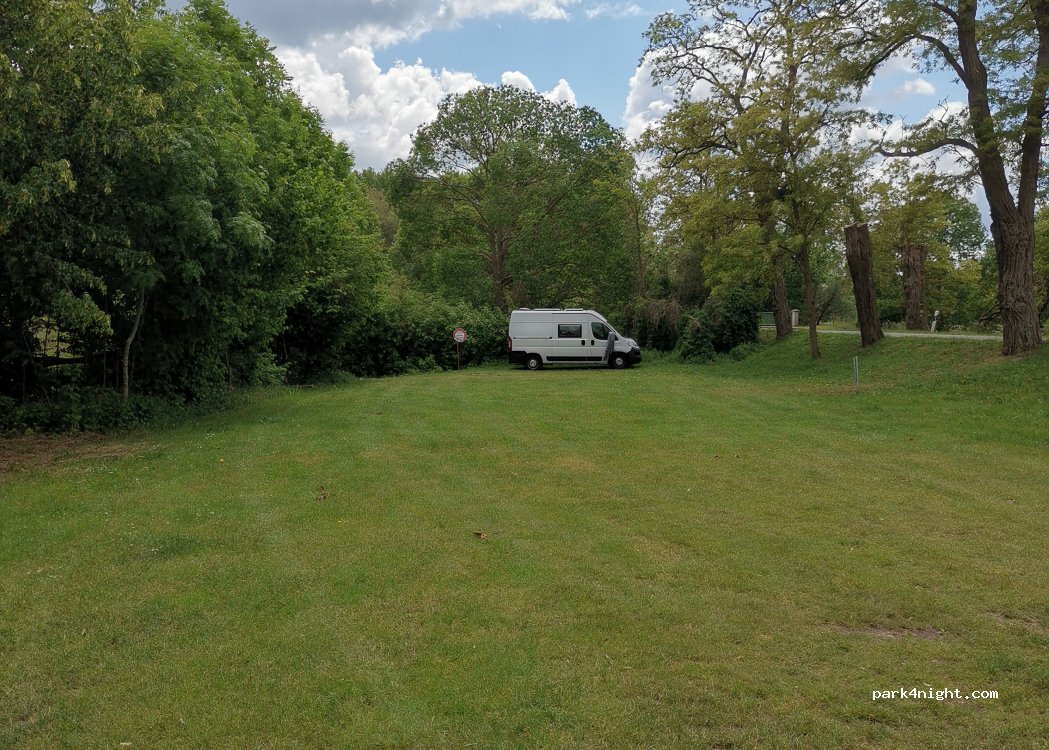 5 designated RV parking spaces in a mixed lot. The community asks for a reasonable donation if you stay overnight. Opposite, separated by a road with little traffic, there is a bathing area with a sunbathing area on the lake. Covered benches with a table are available. No supply and disposal, no rubbish bins in the parking lot. The toilets on the lawn were closed in July 2023
