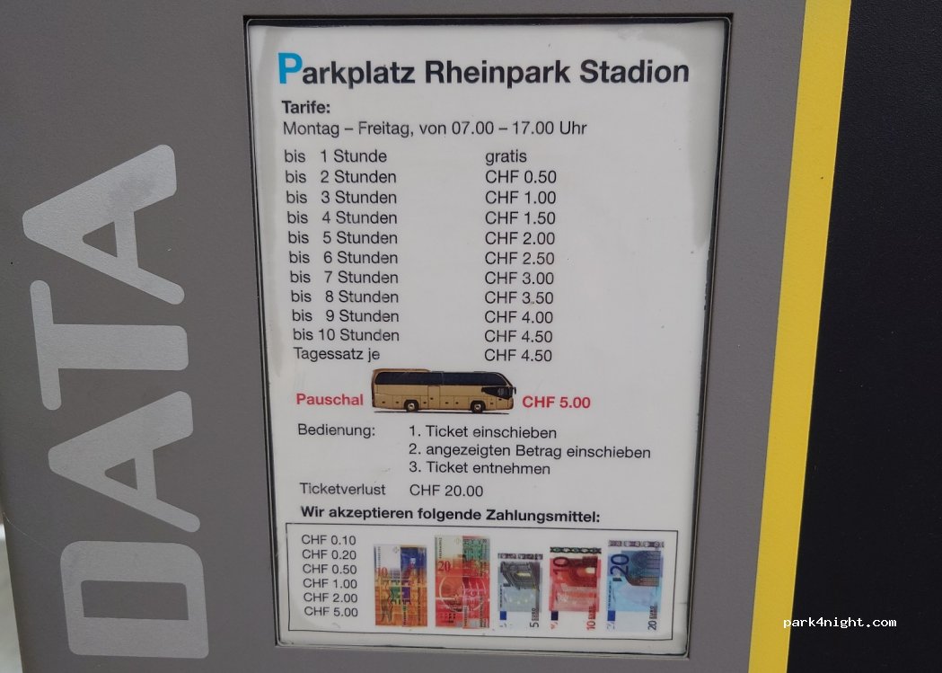 Stayed 12Apr2025-Free at weekends. Perfect base to explore Vaduz, only a short walk into the center. Safe and secure stadium parking lot, we had 2 small kids and felt very safe. Public toilets in need of maintenance (no toilet paper, not very clean). Breathtaking scenery. Highly recommend for an overnight/weekend stay.