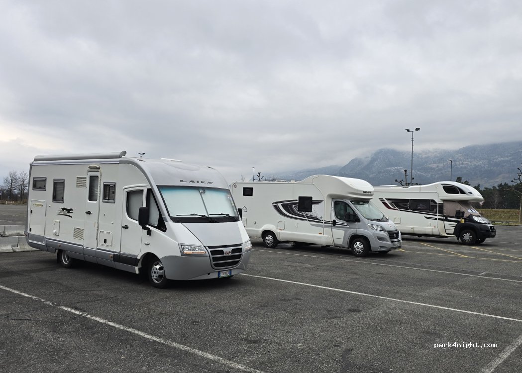 Parcheggio adiacente allo stadio comunale. Gratuito dalle 17 alle 7. Toilette, contenitori rifiuti e acqua disponibili. Presente anche un distributore di snack. Consigliato per una notte, magari per riposare e riprendere il viaggio il giorno dopo.