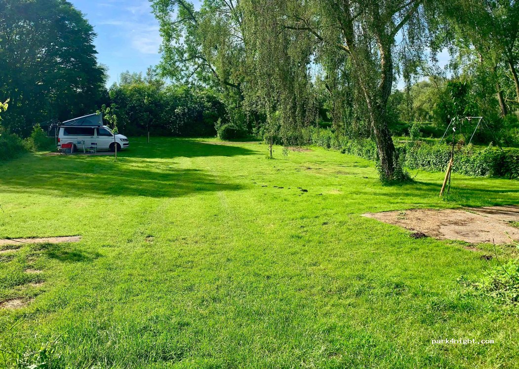 Aardige camping achter de vaste plekken. Vlakke ondergrond om de camper waterpas te stellen. Verder hobbelige veldjes, waar haasjes een paar keer per dag vrolijk rond huppelen bij de camper. Er staan prachtige fruitbomen en er is een fantastisch mooi nieuw en ruim sanitair gerealiseerd. Het contact met de eigenaar verliep alleen telefonisch, betalen kan contant of overmaken.