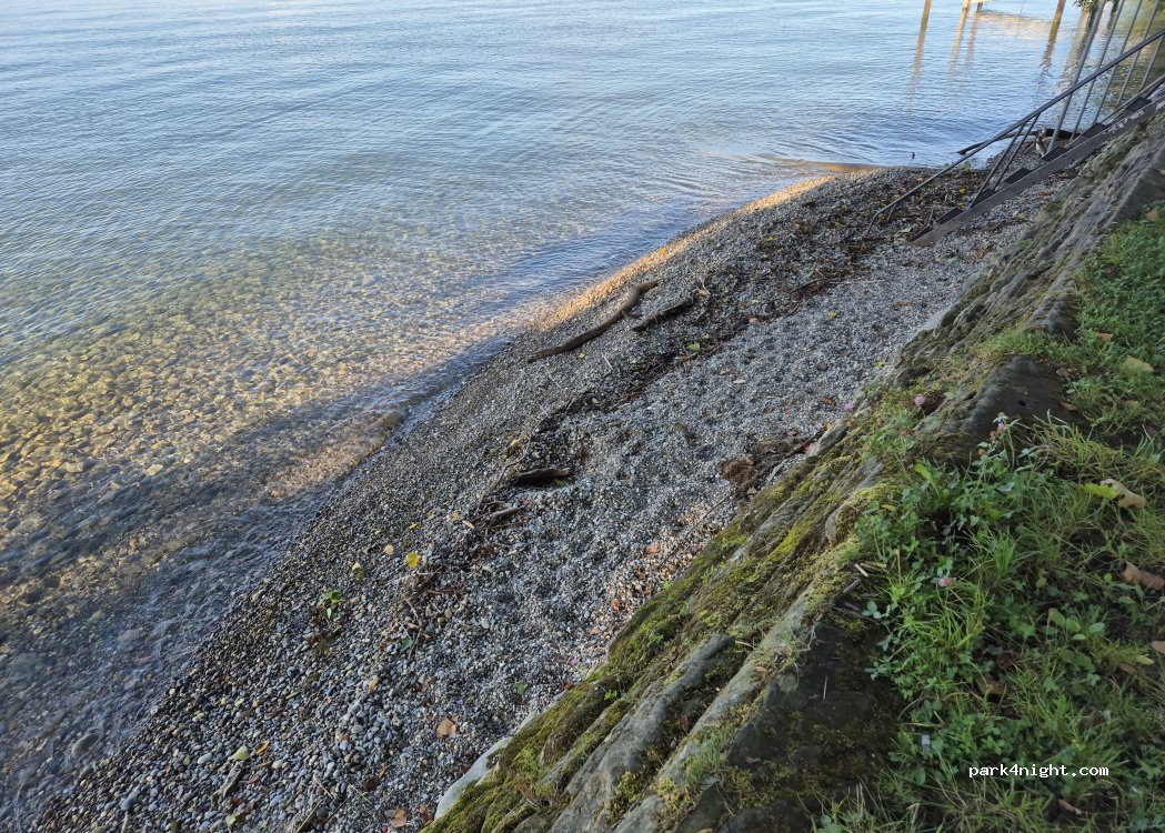 ONLY FOR VEHICLES UNDER 2M HEIGHT (H1 or lower). Handy stairway into stunning water. Beautiful sunsets in summer, quiet nights. No toilets on the premises but only a 10 minute walk or a 2 minute drive to a public toilet. Cost: 1 CHF for 1h. Please be responsible and don’t litter. Enjoy!!