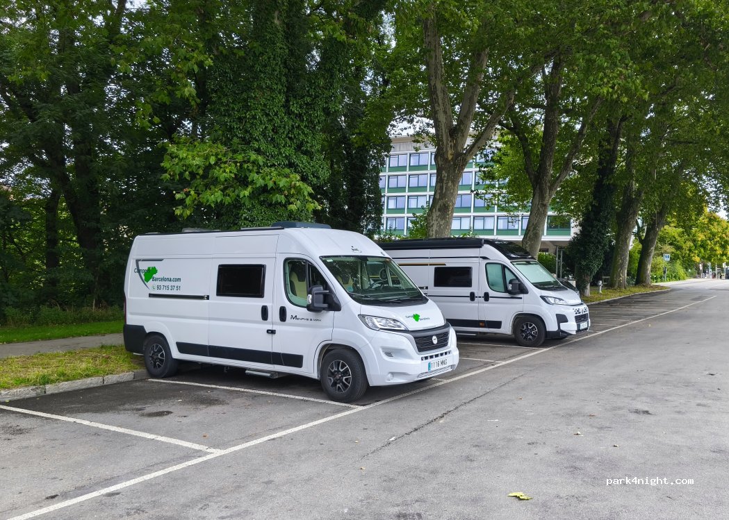 Buen sitio para aparcar de día. Tenemos una Rimor Seal 9 de 7.3m y hemos aparcado sin problema, con el voladizo sobre la zona de césped. El parquímetro va sólo con francos suizos, nosotros utilizamos una app recomendada en el mismo parquímetro.