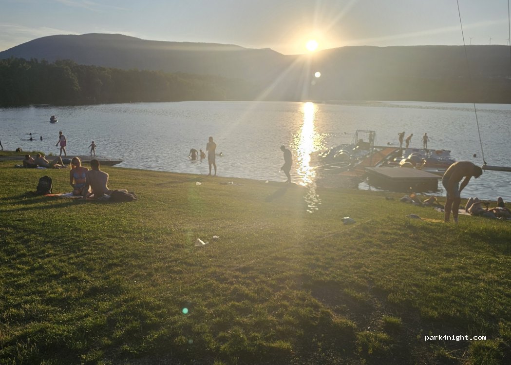 Camp plus petit, aucune réservation requise. Plage publique avec une eau extrêmement claire et vue sur les monts Métallifères. Buffet et bière pression Pilsner. Les chiens hurlent ..