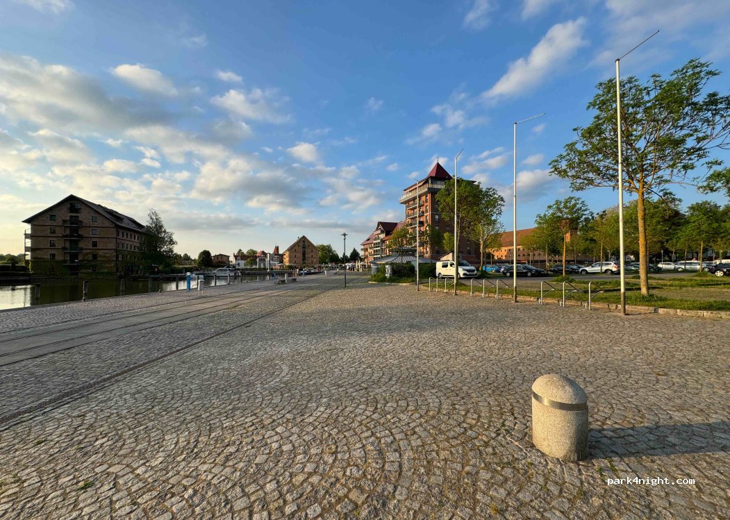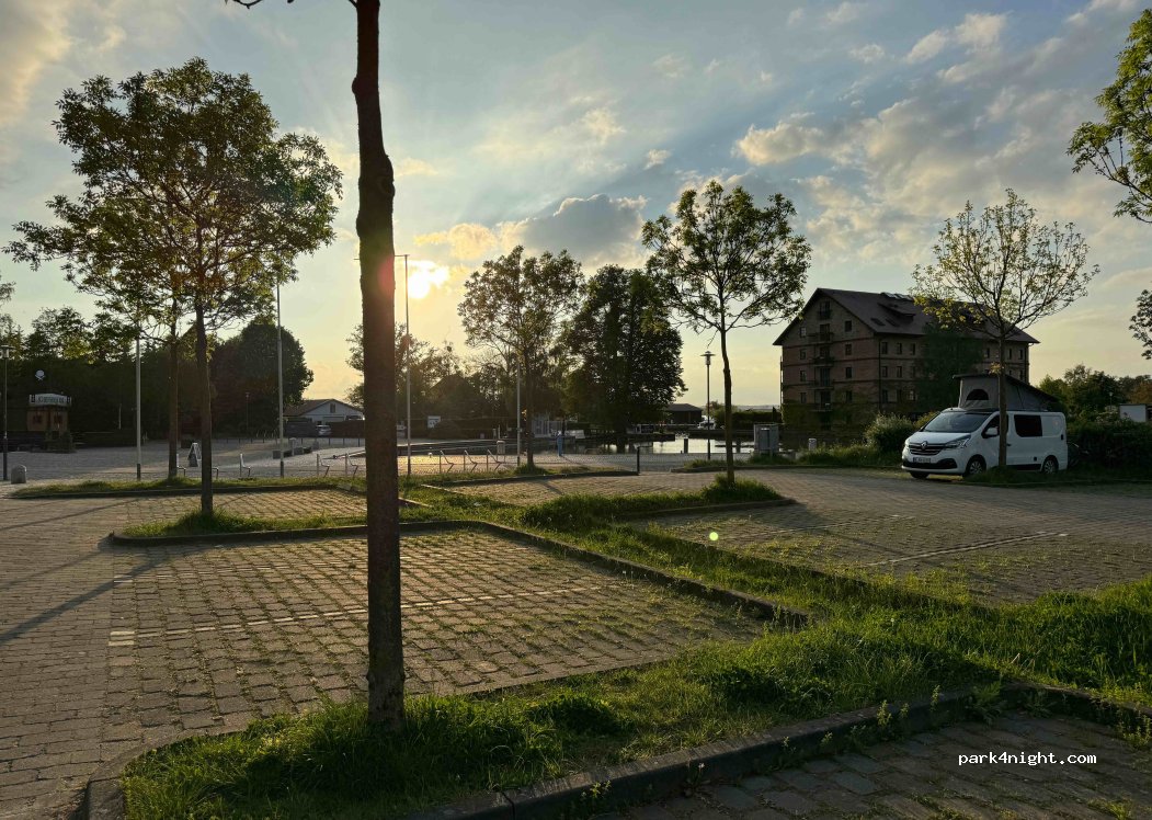 60% occupancy in the nearby RV parking, the harbor master recommended that we stand in the public parking lot for free. At night there were about 8 other campers in the parking lot with us. But since the parking lot is large, you still have plenty of space for yourself. Public toilets are right next door. You are then right at the port with small restaurants and you are right in the middle of the city. Nice place! Forbidden to stay the night