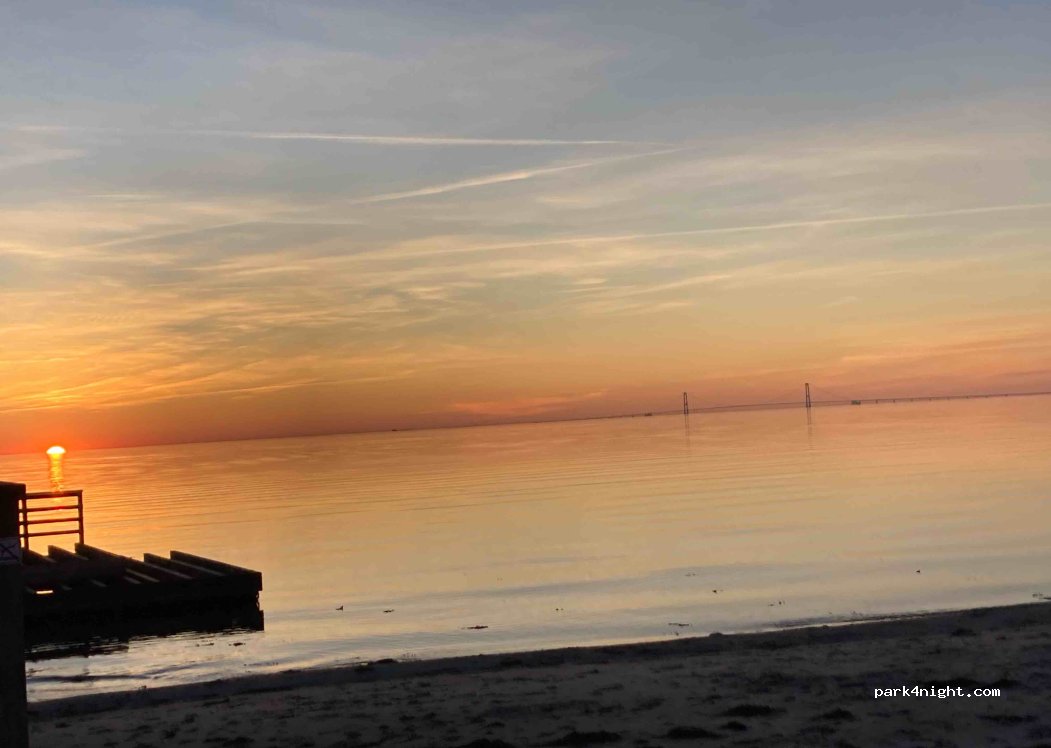Sehr großer Parkplatz, hauptsächlich für PKW. Außerdem gibt es, etwas versteckt, ein Schild mit "No Camping". Der Strand ist wohl der bestgepflegte Strand von ganz Seeland. Hunde sind nicht erlaubt, nichtmal angeleint! Schöne Aussicht auf die Brücke. Uns war es dort zu touristisch. Deshalb waren wir nur kurz dort.