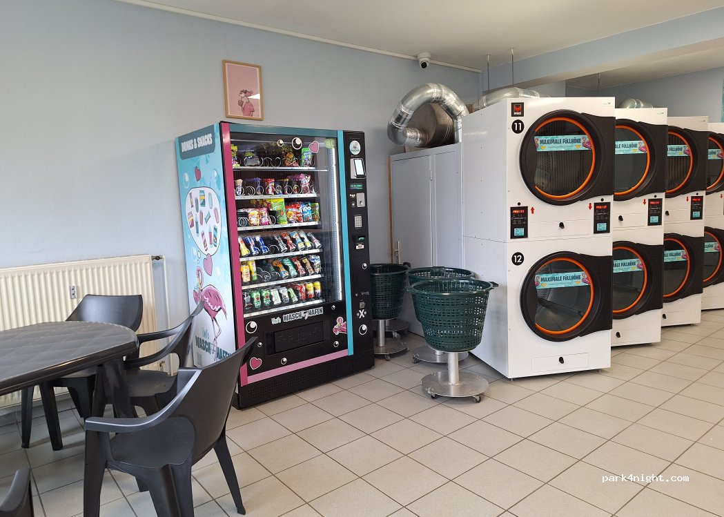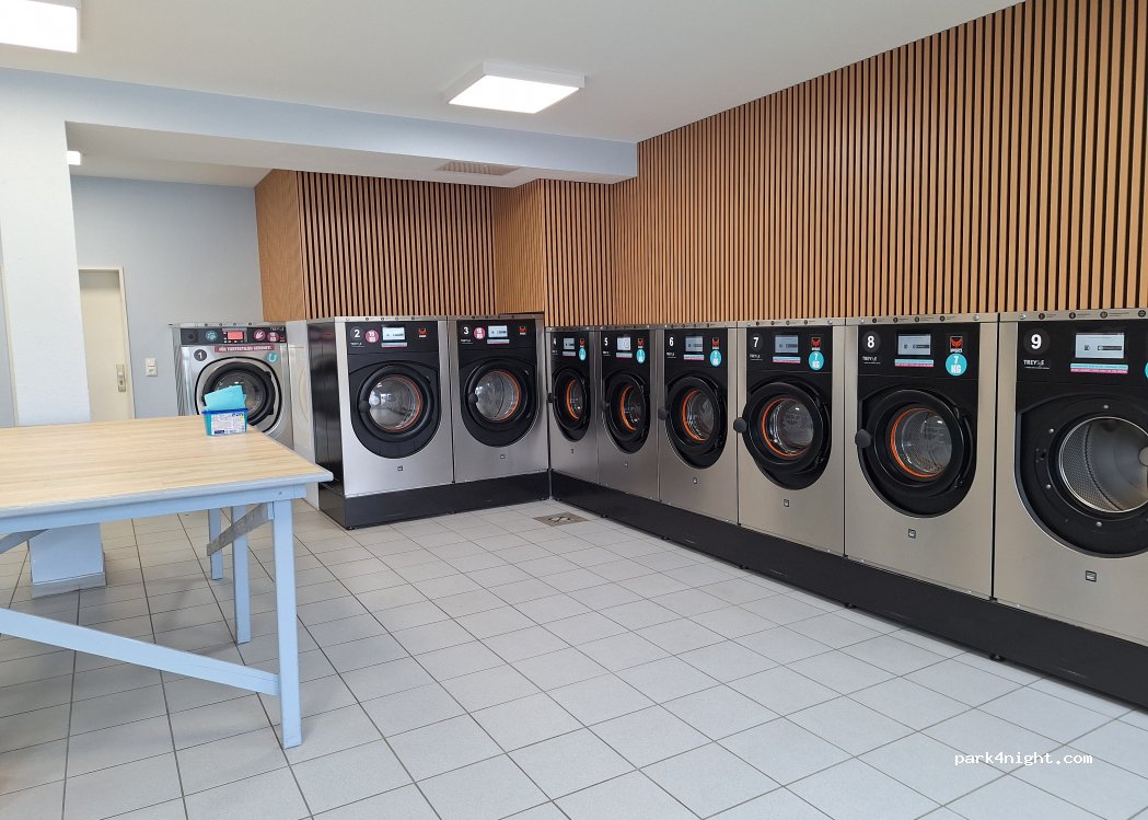 Sehr schöne und hochmoderne Waschanlage, Bedienung mit Sprachauswahl und Programmauswahl, sogar Maschinen, die extra für Tiertextilien sind. Eine normale Wäsche dauert etwa 34 Minuten. Trocken je nach Füllmenge auch wenig zeitauwendig. Ebenso ist ein großer Tisch zum Falten der Wäsche vorhanden.