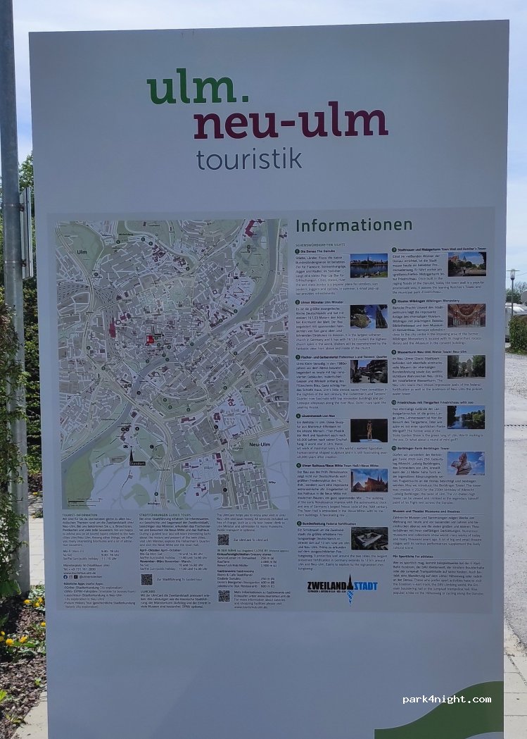Abbiamo trascorso qui una notte a luglio (€14, piazzola standard due adulti con camper). Molto silenziosa e sicura. Acqua e corrente si pagano a parte. In una mezz'ora a piedi si arriva in centro a Ulma. Illuminata di notte. Presenti bidoni della differenziata.