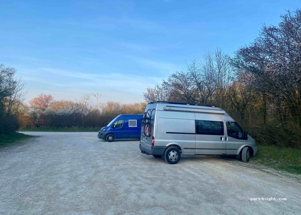 Parking at Lake Echingen. Full during the day in summer, but there is enough space. Places surrounded by trees and hedges and protected from view. Motorway close but barely audible.
