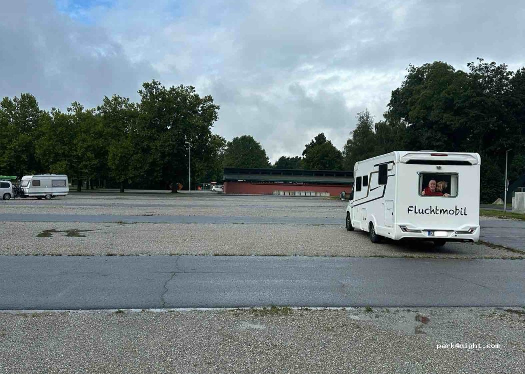 Niederbayernhalle in Ruhstorf an der Rott. Riesiger Parkplatz, in Coronzeite ist die Halle und das anliegende Freibad geschlossen. Schattige Plätze, Eisenbahn fährt vorbei, hat uns nicht gestoert. Keine Entsorgung.