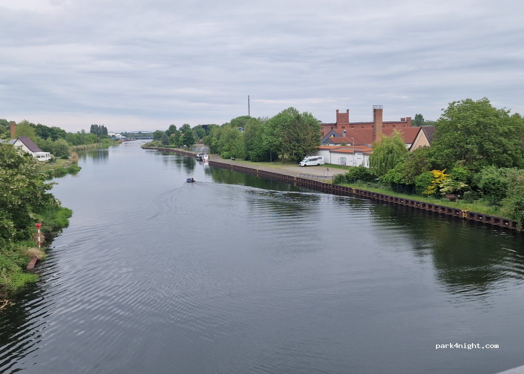 Auch wenn die Gegend erstmal nicht die Schönste ist, zeigt sich der Platz doch recht idyllisch und lädt zum Spaziergang am Elbe-Havel-Kanal ein. Die Autos stehen allerdings in praller Sonne (so sie denn scheint). Ein schattig Plätzchen findet man dann lediglich am anschließenden Mauerwerk. Lidl gleich ums Eck, Edeka und Bäcker etwas weiter, aber noch immer nah, genauso wie ein türkischer Imbiss.