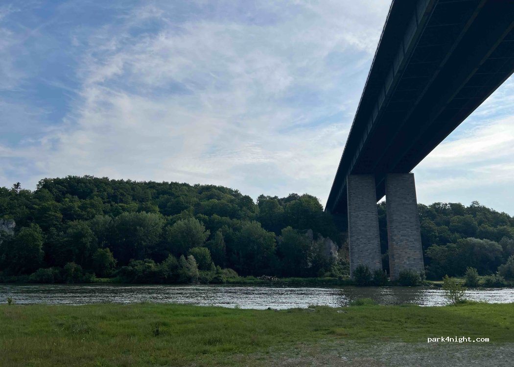 Rund 5 Minuten von der Autobahn entfernt; ein toller, sauberer Spot; teils Schotter, teils Rasenfläche. Autobahn hört man natürlich, aber im ausgebauten Kastenwagen eher ein Grundrauschen; (mindestens) samstags fahren ab 9.30h kleine Motorboote auf der Donau.