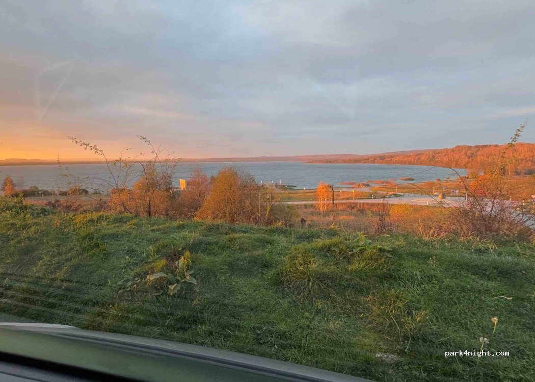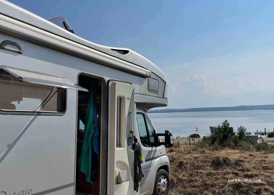 Kleiner geschotterter Stellplatz fürca 8-9 Wohnmobile. Grandioser Blick über den See!!!! Wir hatten Glück und haben noch ein freies Plätzchen gefunden Rad-, Wander-,Joggingstrecke direkt unterhalb. Es war ruhig; einige Jugendliche, die sich unten am See abends treffen aber nicht übermäßig laut sind. Ein angenehmes Miteinander.