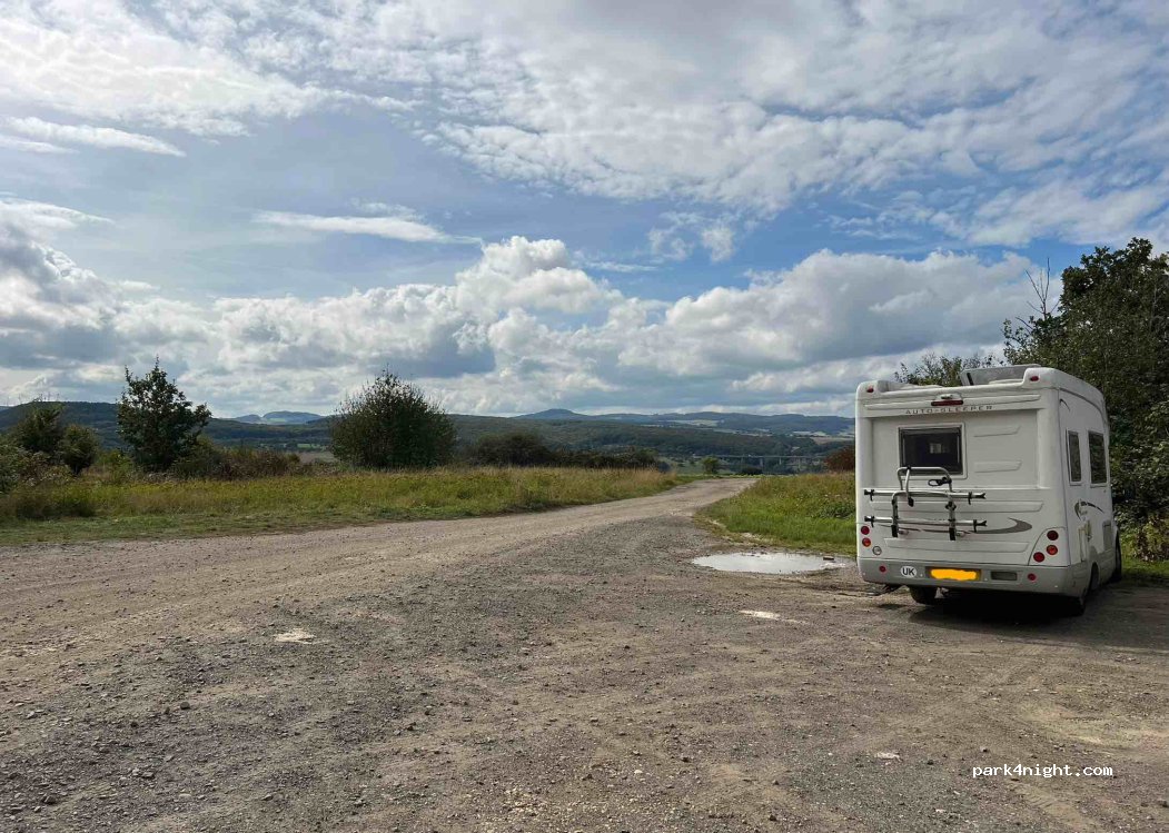 Quiet Hiking car park with a Picnic Area and a beautiful panoramic view of the Voreifel. A simple car park without service. In good wether the tower of Olbrück Castle can be seen in the distance. about 10km away. Depending of the winddirection, you can hear the A61 whispering in the Background. I stood there alone for the night.