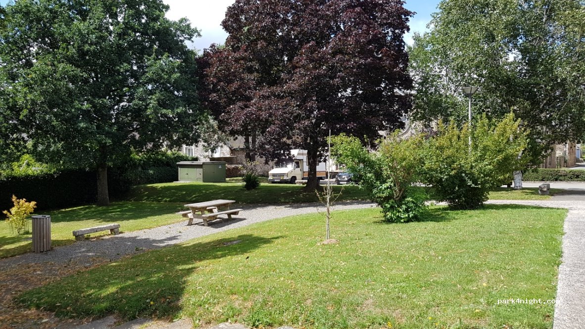 Dans le village, petit parking en bord de route passante mais en retrait, face mairie et eglise. légèrement pentu. pas de service ni toilettes. tables de picnic. bar restaurant traiteur en face.