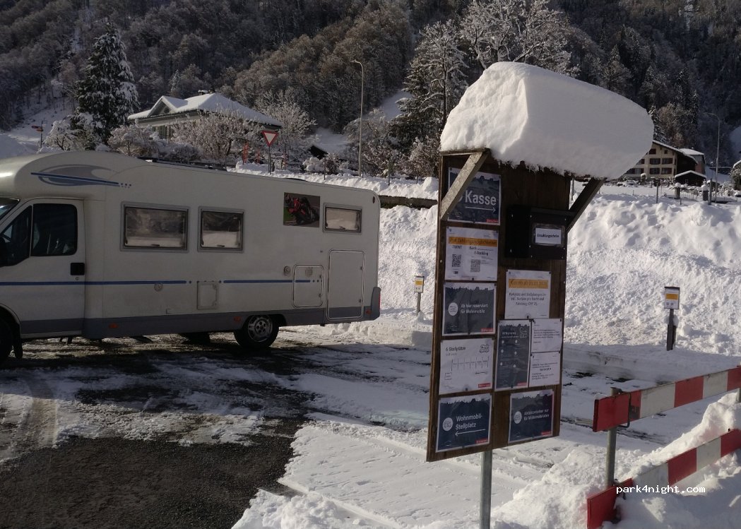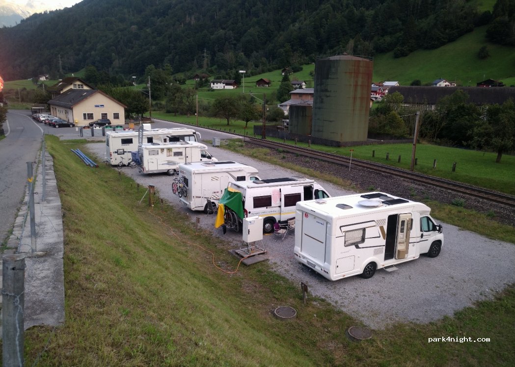 Sehr gut angelegter Kiesplatz. Stromanschlüsse. Direkt neben dem Bahnhof, wo man die Toiletten benutzen kann. Seit Mai kostet ein Standplatz Fr. 10.00/Nacht inkl. Strom. Bezahlbar per EZ oder Twint.