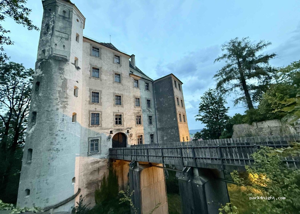 Gratis plek om te parkeren/overnachten. Navigatie stuurde ons door een smalle straat, maar je moet omhoog richting het kasteel. ’s Ochtends wat lawaai door auto's bij de kantoren. Geen toilet gevonden, maar beneden is een bakkerij open vanaf 6:30.