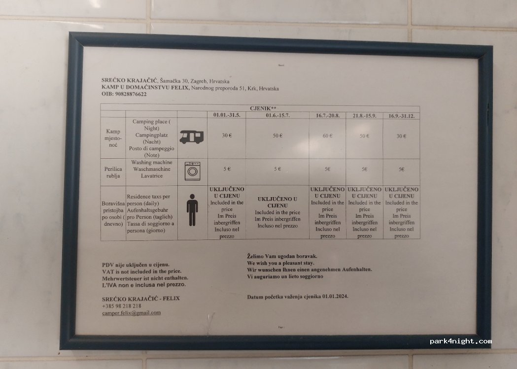 Hors saison 150 kn ou 20€ l'emplacement quel que soit le nombre de personne. Hôtesse très sympathique, sanitaires très propre. Tous les services pour un camping car son disponibles. Centre de Krk à 5 minutes à pied.