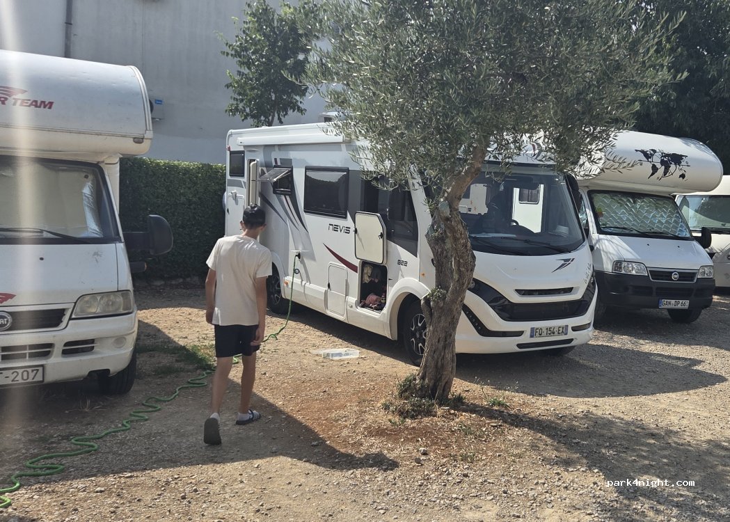 Parking chez un particulier peu d’ombre sanitaires ok accès plage et vieille ville ok accueil sympa accès ok camping car 7,5m prix habituel pour la Croatie ;-)