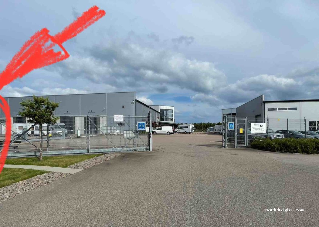 Very useful parking place. 100kr with electricity and 50kr without payable via box or inside adjacent huge motorhome dealership.