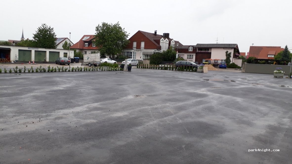 Ein einfacher Platz auf der Fläche einer ehemaligen Spedition, größtenteils geteert. Nur im westlichen Teil Schotter. Der Blick ist nicht berauschend. Garagentore und Häuser. Alles in allem eher lieblos. Auf der Teerfläche nicht parzelliert, daher entweder Kuschelcamper oder Markise mit viel Abstand. V E, Strom teilweise. Der Main ist über der Straße, aber keine Bademöglichkeit. Für 1 Übern. OK.