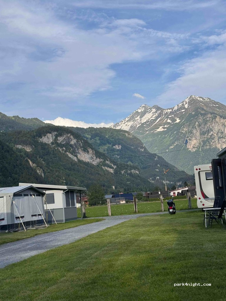 Coin extra, même pour une place "simple passage" la plus petite. Tout est top. L'accueil, les sanitaires, le lieu... 30.50 pour un bus camping et 1 adulte, rien à redire. Commandes petite déj possible. Recharge véhicules électriques. Piscine (bon, plus là, il fait trop frais...) Accès au village de Meiringen à 15min à pieds... Je reviendrai !