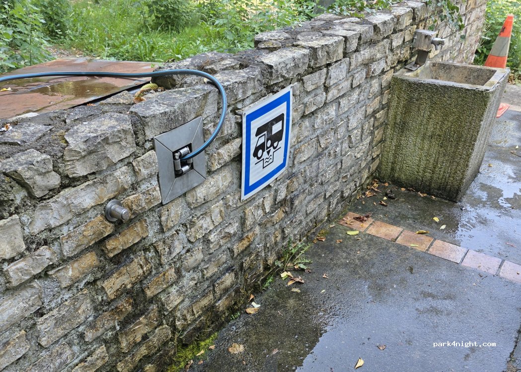 Évacuation des eaux grises, vidange wc , eau . Petite aire de jeu à côté pour que les enfants patientes . Service gratuit