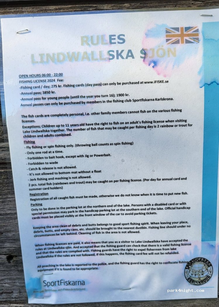 Parking sur l'herbe à côté du lac Lindwallska. Il y a des toilettes sèches. Thrash can est disponible à la zone de grill au bord du lac. Pour 220kr / jour, vous pouvez pêcher la truite arc-en-ciel et la truite.