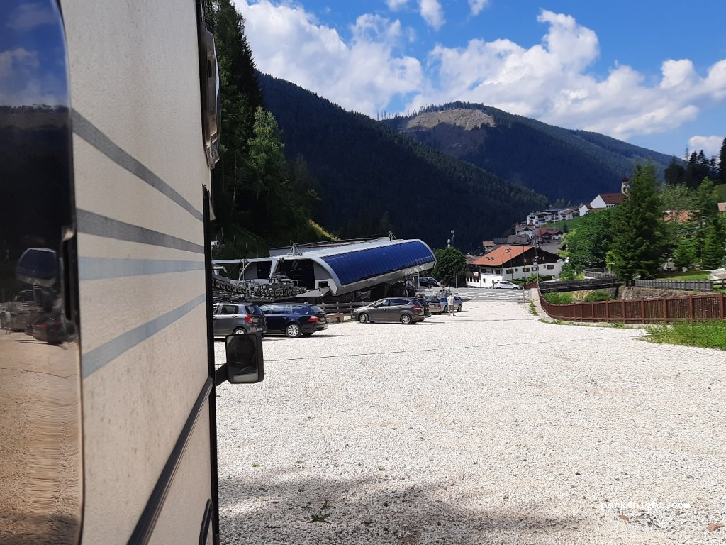 Super spot gratuit. Il faut aller tout au bout sur la partie non goudronnée. La plus plate. Faites attention à ne pas vous mettre en pleins milieu pour laisser le passage aux vélos. Stationnement possible uniquement hors période hivernale. Vous avez la wifi gratuite au télésiège! Le lac de Carezza est à 4,5km pour 1h30 environ.