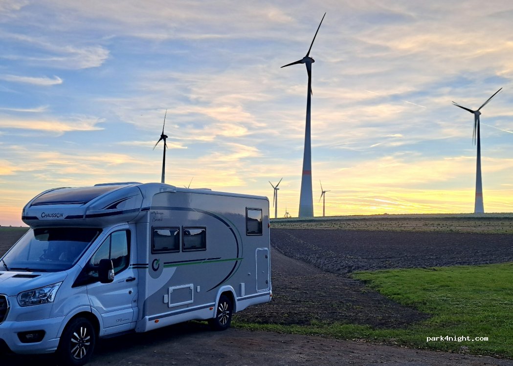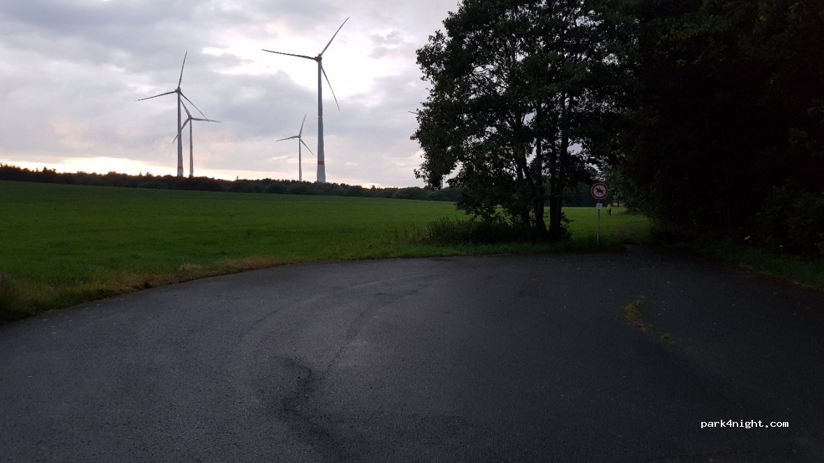 Parkplatz am Ende einer Sackgasse, Anfahrt schmal, aber problemlos. Neue und damit leise Windräder. Ich habe sehr gut geschlafen. Aussicht über Wiesen und Felder. Dank Unwetter am Abend niemand unterwegs.