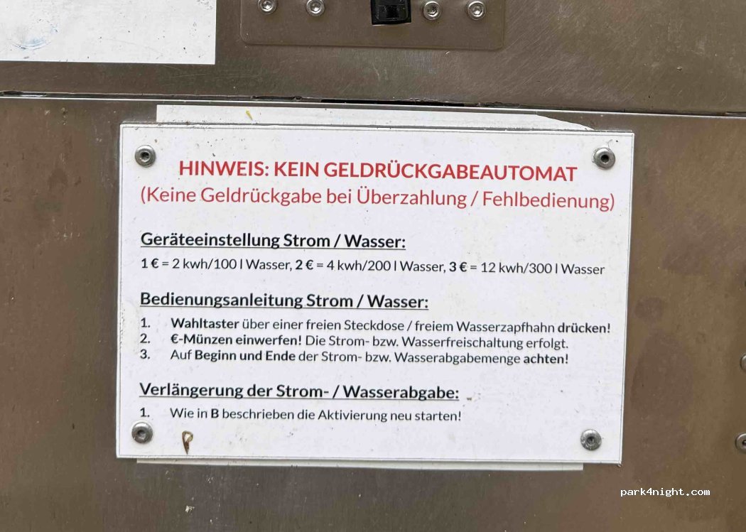 September 23 funktioniert die Ver-/Entsorgung problemlos. Klar, es ist kein Premium-Stellplatz, aber er ist kostenlos, nahezu rund um mit Wald umgeben, es gibt sogar ein WC und es ist Tags wie nachts extrem ruhig. Momentan ist an einer Flanke des Platzes ne Riesen Baustelle, dafür 1 Punkt Abzug, aber alles okay, hier kann man guten Gewissens übernachten. Strom 1€ für 2kWh geht auch absolut klar.