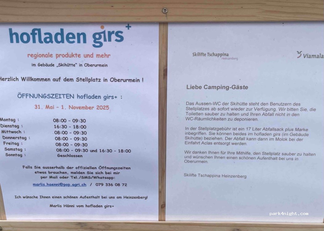 Neu ab Mai 2021: 24CHF pro Nacht/ WC- Aussenanlage des Restaurants Skihütte ist Tag & Nacht geöffnet, im Restaurant kann ein Gebührenabfallsack bezogen werden. Bezahlung per Twint, Kreditkarte etc.
