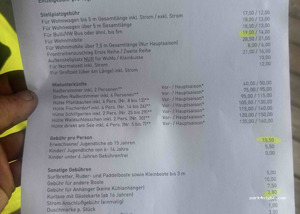 14€-19€/motorhomes + 10.50€/adult + 2.80/tourist t