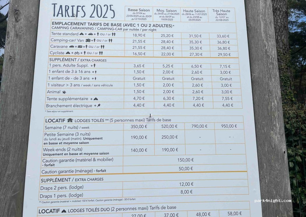 Les prix sont à réactualiser. C'est entre 19.50 et 29.50 l'emplacement selon saison. Cales nécessaires pour certains emplacements. Le local sanitaires est juste avec seulement 2 wc et une demie douzaine de douches, commun hommes et femmes. Seulement 2 éviers pour la vaisselle. Lors du week-end prolongé de l'ascension, c'était déjà limite alors que tout n'était pas occupé.