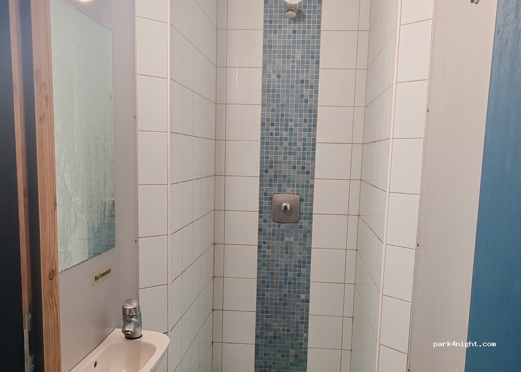 Caravan parking space next to the golf course parking lot. Other access is limited by a railway underpass 2.5 m high and a maximum of 2.3 m wide but other way is by normal road. There is also a swimming lake with a kiosk, toilets and shower and a restaurant on the golf course.