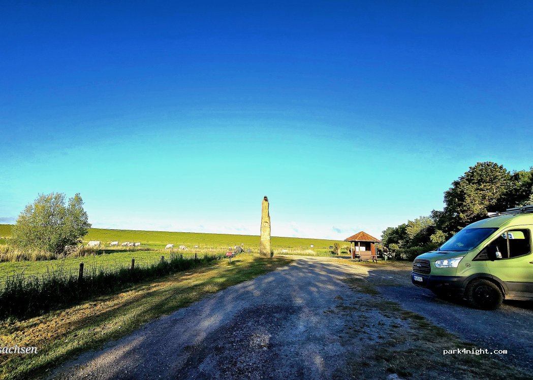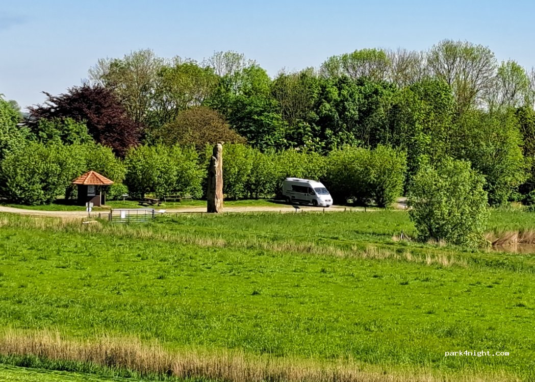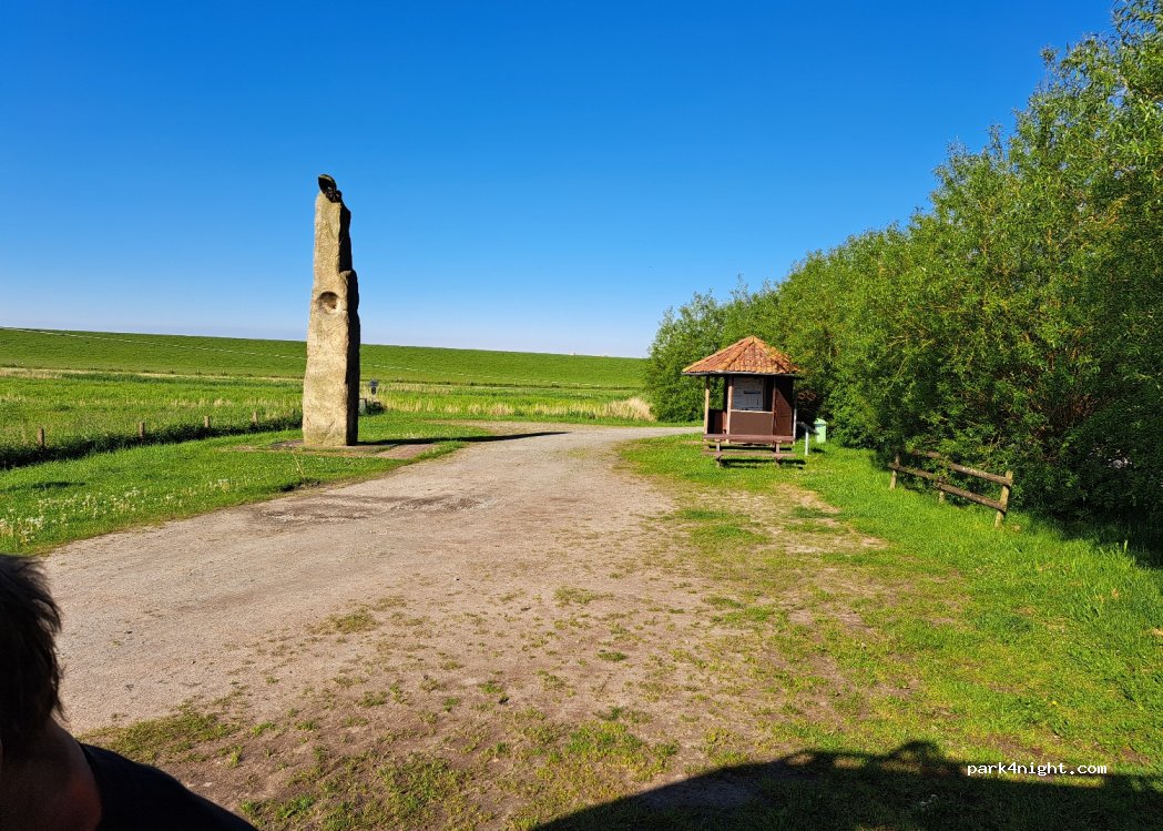 Kleiner ruhiger Parkplatz direkt hinter dem Deich an einem kleinen See. Platz (Schotter und Rasen gemischt) für circa 6 Autos. Am Wochenende mehr Verkehr durch Spaziergänger, Radfahrer und Angler. Am Deich beginnt der Nationalpark, daher sind dort Hunde verboten. Kleine Picknick-Ecke ist auch vorhanden.